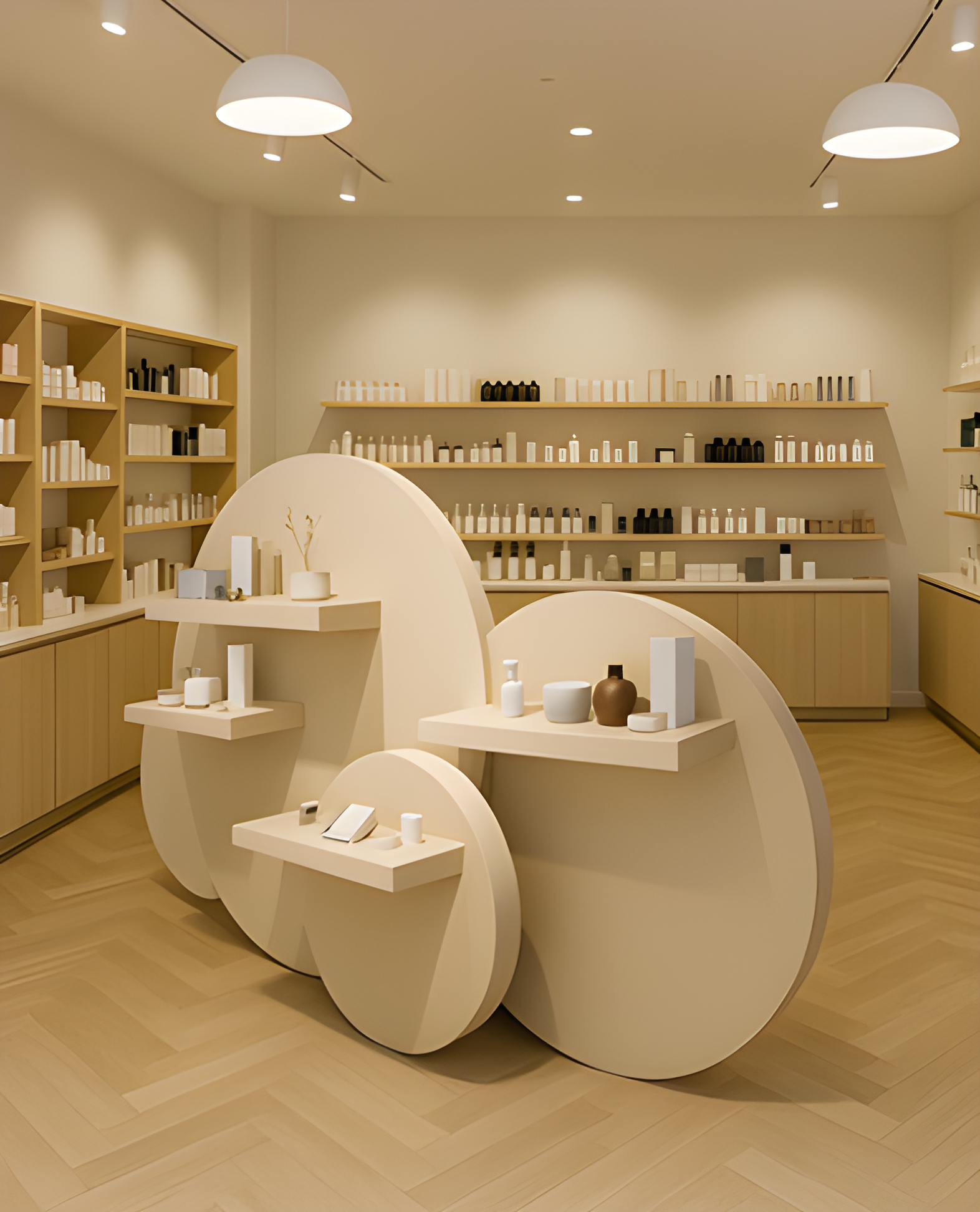 Oubliez les étagères alignées et impersonnelles. Présentez vos produits comme des objets d’art : sur une table d’appoint, un meuble ancien revisité ou une étagère design. Ajoutez un vase, une plante ou une carte explicative.